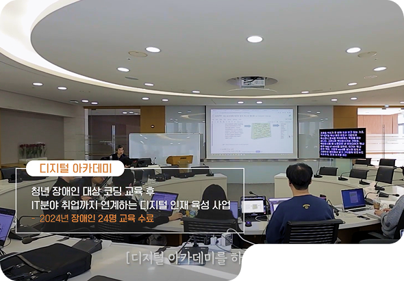 전국의 대학 졸업 또는 졸업 예정인 장애인 대상으로 직무 기초 및 심화, 프로젝트 역량 교육 등 웹 개발 전문 교육을 통해 코딩 전문가로 육성하여 IT 기업 채용까지 연계하여 자립을 지원합니다.